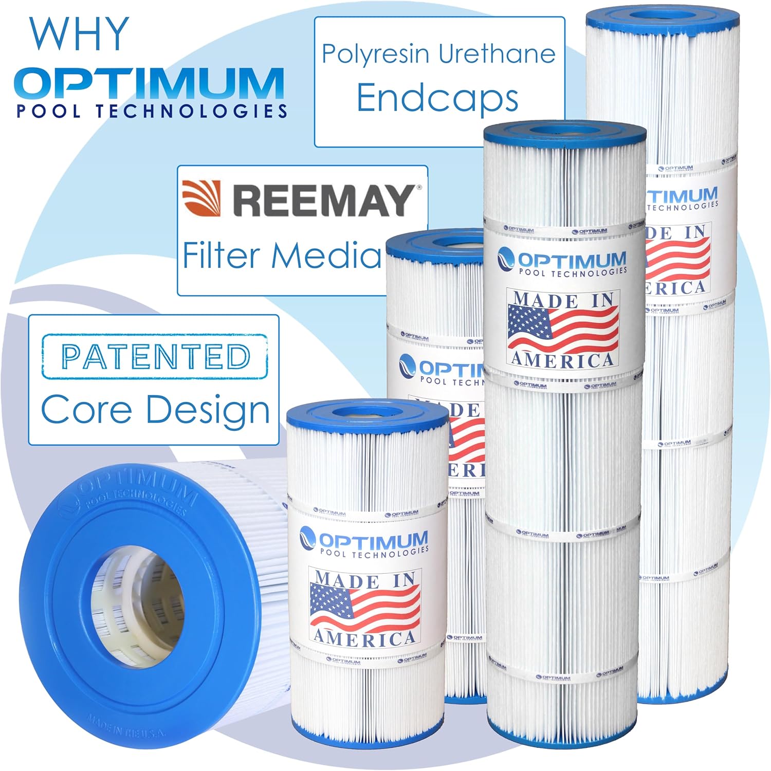 Optimum Pool Technologies makes pool filter cartridges with high quality filter media, a unique poly-resin end cap and reinforced core to ensure the highest quality and durability of filter cartridges on the market today.